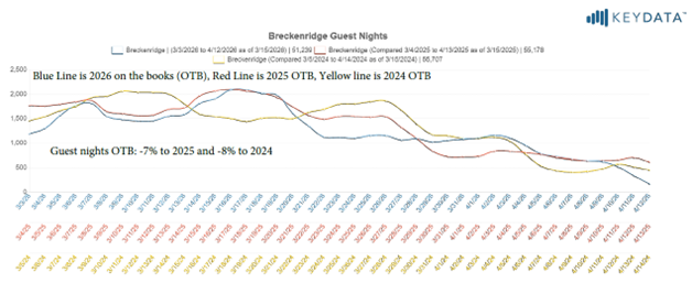 The nights of March 3 to April 12 are represented on the graphs below. Guest nights on the books are -7% to last year and -8% to 2 years ago (2YA). Breckenridge has 84% of last year’s actual nights on the books during these dates. Easter is April 5, 2026.