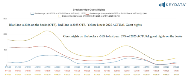 The nights of April 13 to April 30 are represented below. Guest nights on the books are -52% to 2025. Breckenridge has approximately 27% of last year’s actual guest nights on the books. Easter was on April 20, 2025.