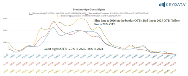 Summer season guest nights on the books are currently pacing -2.7% to summer 2025 and -28% to Summer 2024. Breckenridge has 18% of summer 2025 actual guest nights on the books.